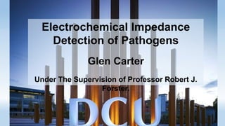 The document outlines a project focused on the electrochemical impedance detection of pathogens, particularly E. coli, under the supervision of Professor Robert J. Forster. It includes various experimental methods, such as cyclic voltammetry and confocal fluorescence microscopy, to study the detection efficacy of different concentrations of bacteria using nanostructured gold surfaces. The findings highlight the effectiveness of electrochemical impedance methods over cyclic voltammetry, potential improvements in capture rates, and suggestions for future detection enhancements.