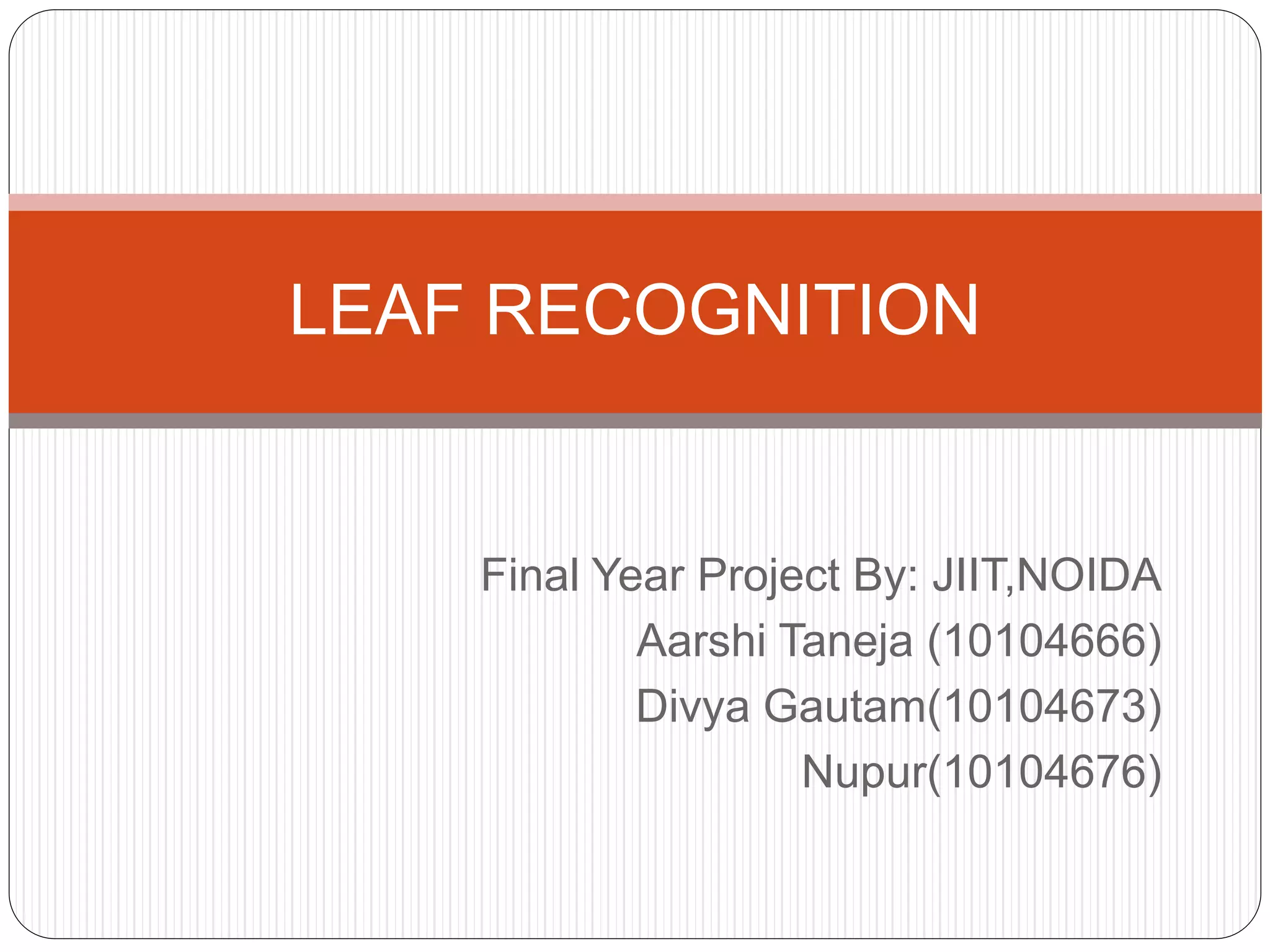 This document discusses leaf recognition through analyzing algorithms like the multi-scale distance matrix and backpropagation neural network. It aims to develop an efficient leaf recognition system with optimal accuracy and a user-friendly application. The multi-scale distance matrix algorithm takes the leaf edge into account to classify leaves by creating distance matrices. A neural network can forecast and classify using input, hidden and output layers along with an activation function. The application will process uploaded leaf images, compare them to a training dataset, and output the matching leaf or a failure message.