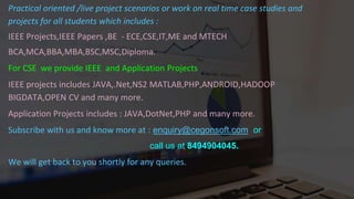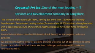 Cegonsoft Pvt Ltd is a leading IT services and development company in Bangalore that has been operating for over 12 years. They have provided training to over 55,000 students and helped over 35,000 candidates get jobs at major multinational companies. They also provide innovative project ideas and guidance to students, with 64 students having achieved university rank records due to projects done under their guidance. Cegonsoft offers practical, real-world projects for various degrees and focuses on technologies like Java, .Net, MATLAB, and Android.