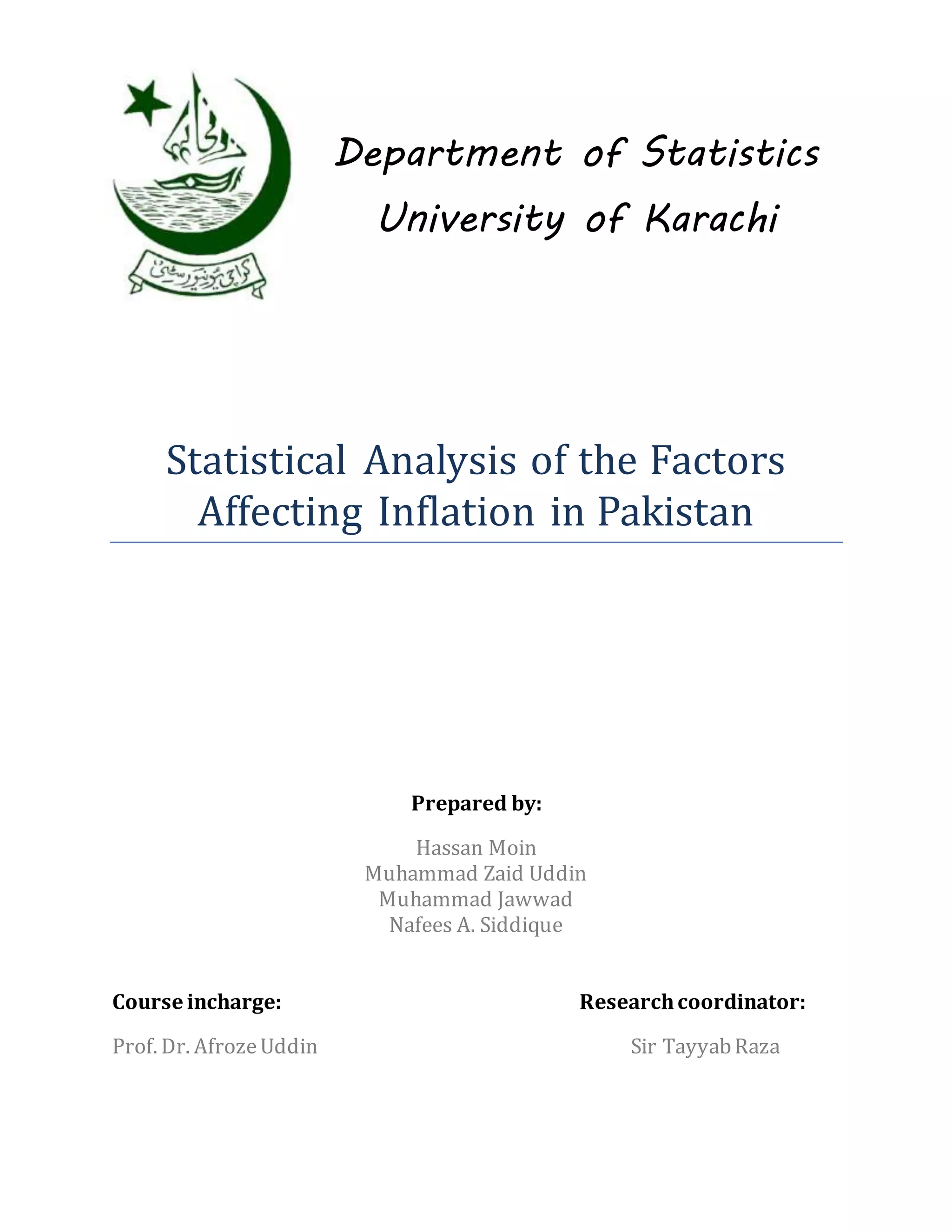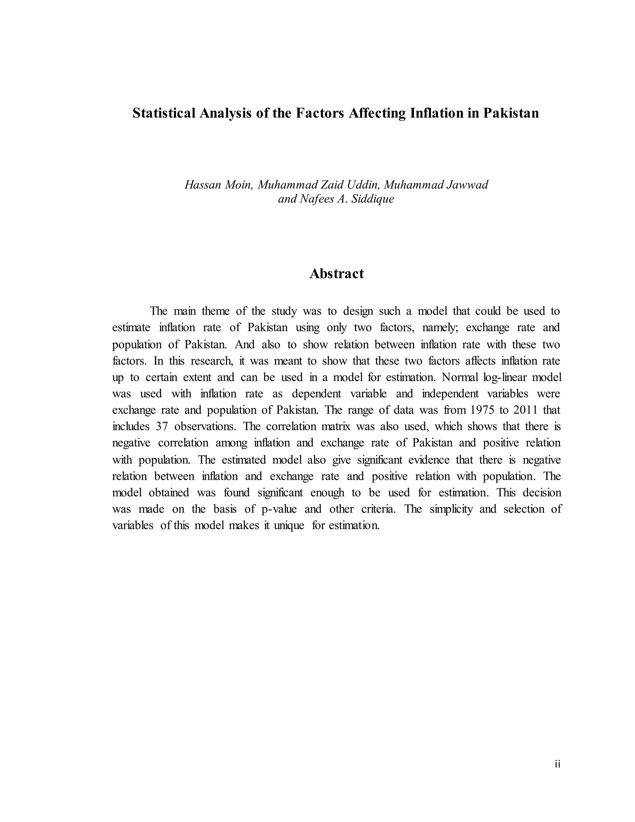 This document analyzes factors affecting inflation in Pakistan from 1975 to 2011. It uses a log-linear model with inflation rate as the dependent variable and exchange rate and population as independent variables. The assumptions of the regression model are validated using statistical tests. Exchange rate is found to have a negative correlation with inflation, while population has a positive correlation. The model is found to be significant for estimating inflation in Pakistan based on the variables of exchange rate and population.
