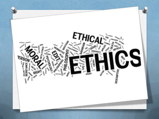 Ethics is the philosophical study of morality and seeks to systematize, defend and recommend concepts of right and wrong conduct. It has three main branches - metaethics examines the nature of moral judgments; normative ethics investigates how one ought to act; and applied ethics examines specific issues. Professional ethics establishes standards for professionals and encompasses honesty, integrity, transparency, accountability, confidentiality, objectivity and respectfulness. Codes of ethics provide guidance to help professionals resolve ethical issues and deter unethical conduct while also educating and building understanding between professionals.