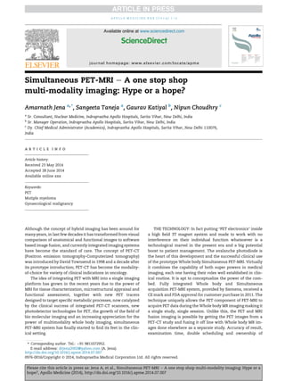 The document discusses the advancements and clinical applications of simultaneous PET-MRI technology, highlighting its potential benefits in oncology, neurology, and cardiology. This integrated imaging system offers improved image registration, shorter examination times, and zero radiation exposure from CT scans, making it particularly advantageous for specific patient populations. The Indraprastha Apollo Hospitals in Delhi is noted as the first clinical site in South Asia to adopt this technology, successfully utilizing it for diverse medical conditions over the past year.