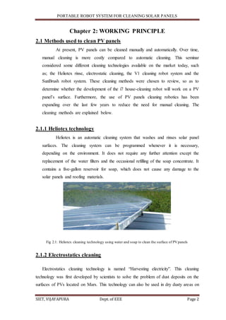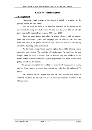 The document describes a proposed portable robot system for cleaning solar panels. The system uses an i7 cleaning robot, usually used for house cleaning, modified with new software to remove dust, pollen, and sea salt from solar panel surfaces. The robot would clean panels autonomously using sensors to detect panel edges and prevent falling. While the new software was tested in simulations, it has not been implemented in real environmental conditions. The system aims to increase solar panel efficiency by regularly removing debris in a cheaper way than manual cleaning.