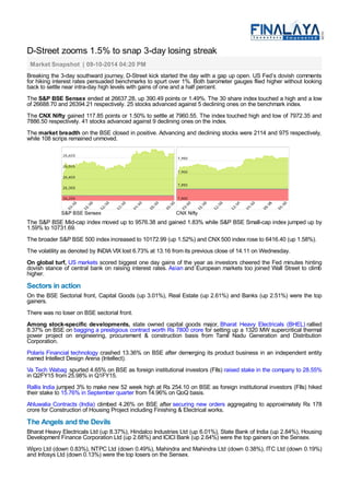 The Indian stock market snapped its three-day losing streak, with the Sensex gaining 1.5% and closing near its daily high. The rally was driven by comments from the US Federal Reserve that suggested a dovish stance on raising interest rates, as well as gains in US and other global markets. Key sectors like capital goods, real estate and banks outperformed, while no sector declined. Several companies saw large share price increases, such as Bharat Heavy Electricals which rose 8.37% after winning a major contract.