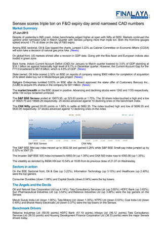 The Sensex gained over 300 points and closed 1.75% higher on the day of F&O expiry, amid news of a narrowed current account deficit in the March quarter. Key sectors like oil & gas, IT and healthcare gained as the CAD for January-March came in at 3.6% of GDP, lower than the previous quarter. Reliance, HDFC Bank, Infosys and TCS were among the top contributors to the gains in both the Sensex and Nifty.
