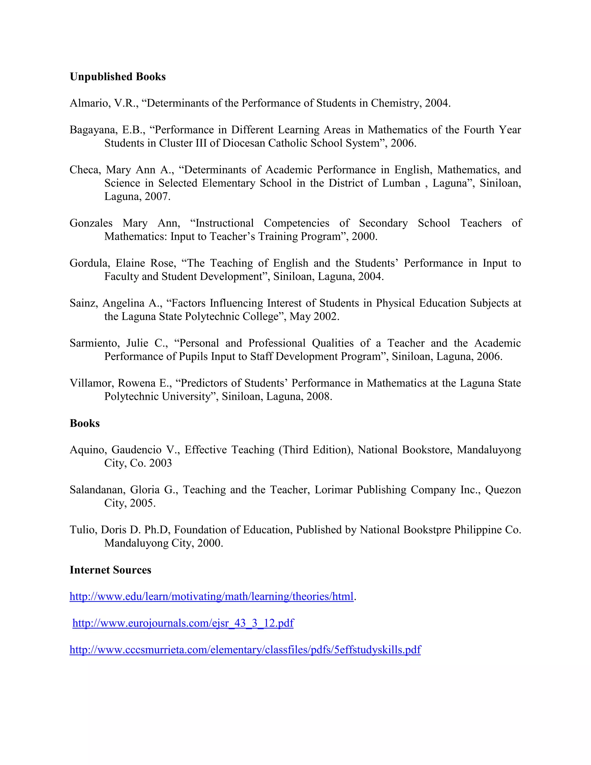 The document lists several unpublished books and theses on topics related to academic performance, teaching skills, and factors influencing student performance and interest. It also includes three published books on effective teaching, teaching and the teacher, and the foundations of education. Finally, it lists three Internet sources on motivating math learning, the effect of study skills, and the effect of study habits on academic performance of freshmen students.