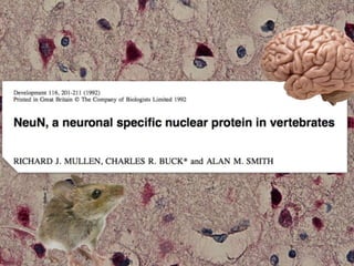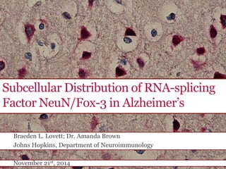 This document summarizes research on the subcellular distribution of the RNA-splicing factor NeuN/Fox-3 in Alzheimer's disease. The study found that in control brains, Fox-3 was largely nuclear, but in Alzheimer's brains it exhibited increased cytoplasmic localization. This may be due to alternative splicing of Fox-3 isoforms with different nuclear localization signals. The results suggest that stress factors in Alzheimer's disease may affect the subcellular distribution of Fox-3 and disrupt its RNA-splicing activity, contributing to disease pathogenesis.