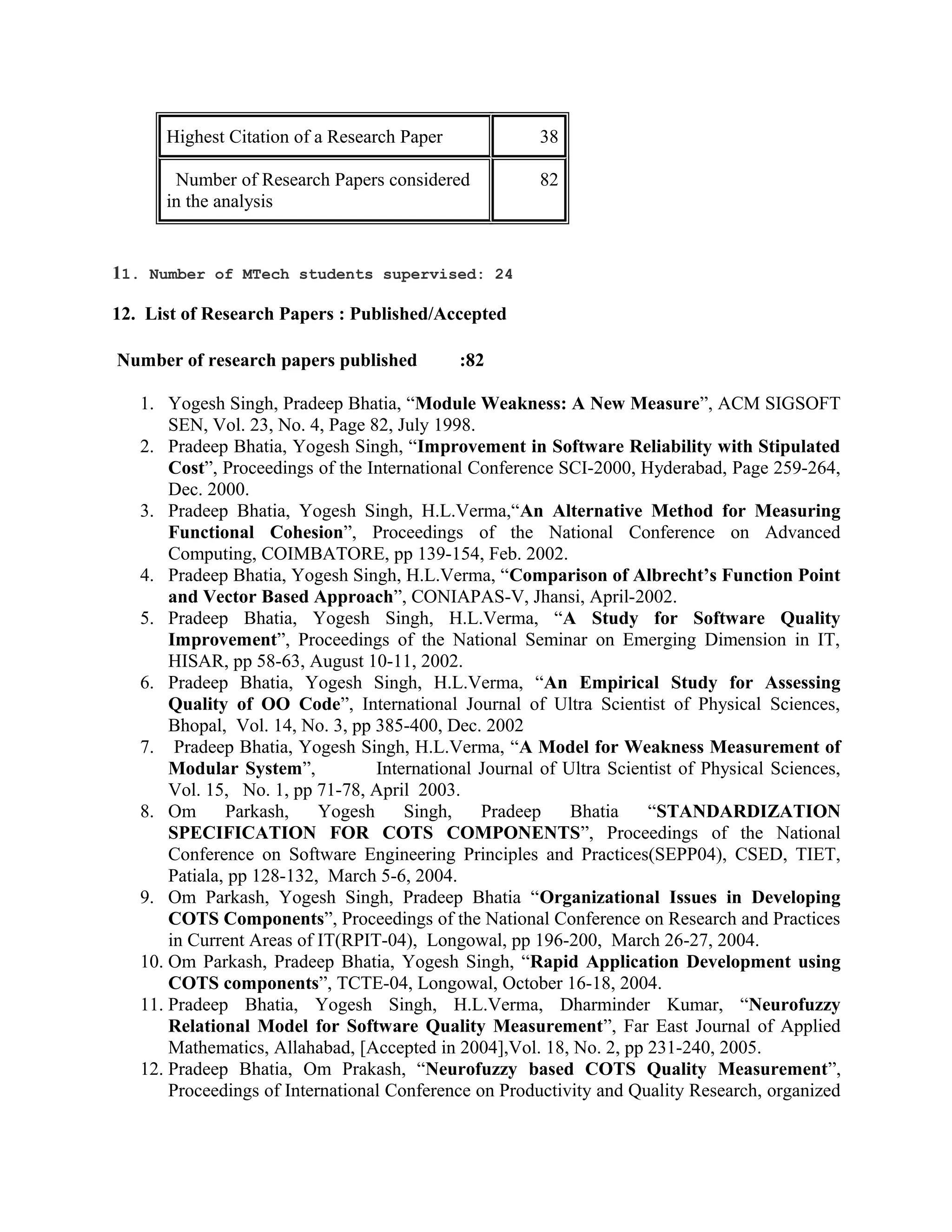 This curriculum vitae summarizes the professional experience and qualifications of Dr. Pradeep Kumar Bhatia. It lists his current position as Professor at Guru Jambheshwar University of Science and Technology. It provides details of his educational background and 23 years of teaching experience. It also includes a list of 82 published research papers in software quality and engineering topics, with citations and students supervised.