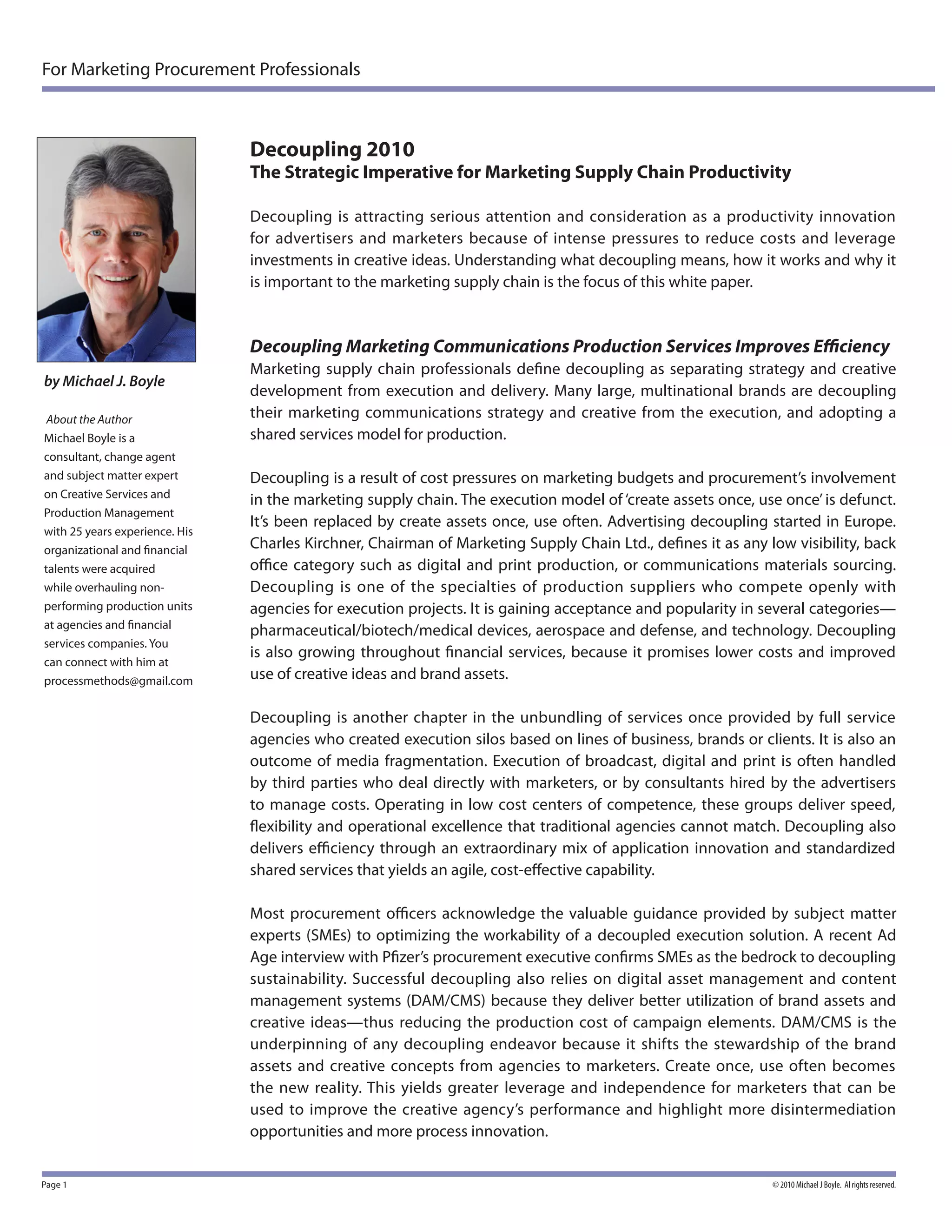 The document evaluates different decoupling tactics like nearshoring, outsourcing, offshoring, and automation. It provides action plans for agencies, marketers, and print service providers to prepare for and take advantage of decoupling opportunities.