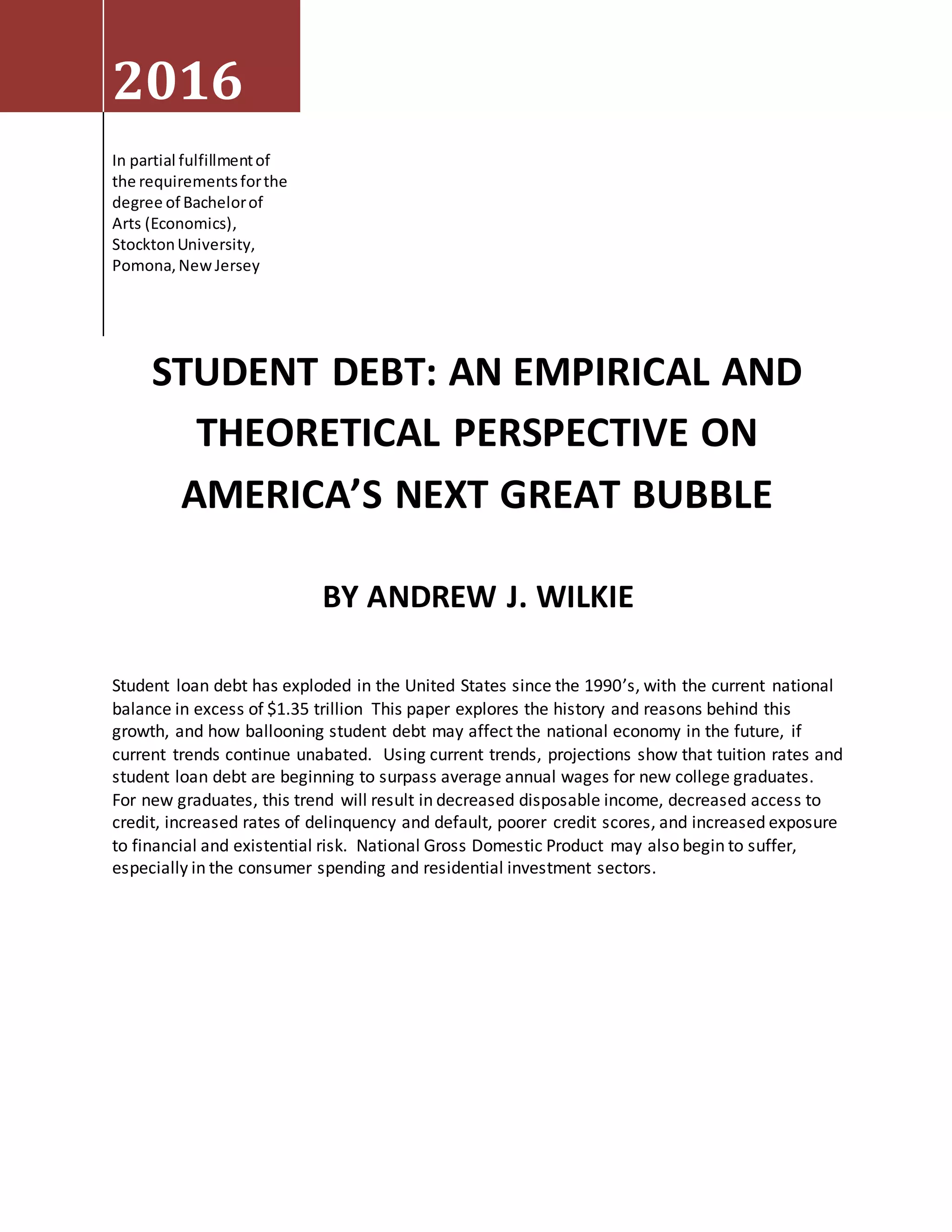 This document provides an overview of a student's research paper on the growth of student loan debt in the United States. It explores the history of rising tuition costs and student borrowing. The paper will examine trends in student debt levels and projections of how continued growth could impact both individual graduates and the broader economy. It will also review previous studies on the topic and the author's own empirical analysis of tuition rates, university finances, and debt levels compared to current labor market conditions for new graduates.