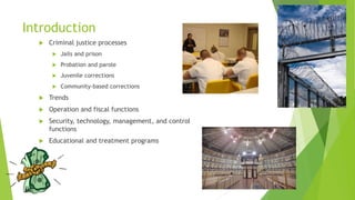 This presentation summarizes key aspects of the corrections system including criminal justice processes, jails and prisons, probation and parole, juvenile corrections, and community-based corrections. It outlines the booking, assessment, and release processes for jails and prisons. It also discusses trends toward alternative and community-based corrections. Finally, it reviews functions like security, education and treatment programs, and concludes that understanding both criminal justice and non-criminal justice personnel is important for policy implementation.