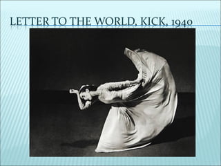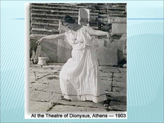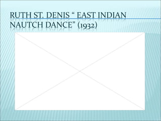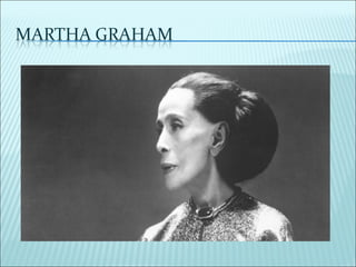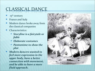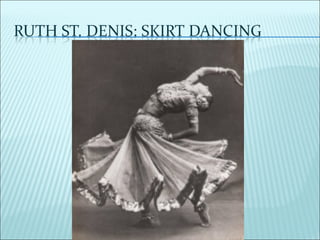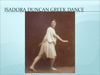 The document provides an overview of the history and development of modern dance. It began in the early 20th century as pioneers rejected the structural formality of ballet and sought more freedom of expression. Key figures mentioned include Isadora Duncan, Ruth St. Denis, Martha Graham, Merce Cunningham, and Twyla Tharp. The document also discusses how modern dance influenced ballet and how genres have continued blending over time.