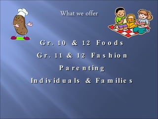 Gr. 10 & 12 Foods Gr. 11 & 12 Fashion Parenting Individuals & Families