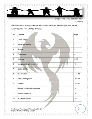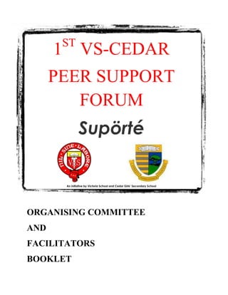 The document provides an itinerary for a two-day peer support forum between Victoria School and Cedar Girls' Secondary School with the theme of "Supörté" which means support in Portuguese. Day 1 activities include registration, icebreakers, and a talk on leadership development. Day 2 activities include talks on transitional support and social emotional learning, group work sessions, an amazing race, and a closing ceremony. The itinerary outlines timing, locations, responsibilities of organizing committees, and logistical details to facilitate the events.