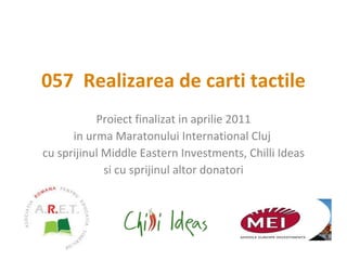 Proiectul 'realizarea de carti tactile' a fost finalizat în aprilie 2011 și a fost destinat copiilor cu deficiențe de vedere din Cluj-Napoca, oferindu-le acces la cunoștințe prin intermediul imaginilor tactile. Activitățile proiectului au implicat cadre didactice și au avut ca scop eficientizarea procesului de învățare, îmbunătățind experiența educațională a celor 68 de elevi. Proiectul a beneficiat de suportul mai multor donatori și resurse donate, incluzând materiale diverse pentru crearea cărților tactile.