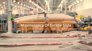 This document discusses aircraft escape slides. It begins by listing 5 student names and IDs. It then provides background on escape slides, stating that they are inflatable slides used to evacuate aircraft quickly and are packed within the door structure. The objectives are to understand how escape slides are made and maintained to meet regulations. It details the invention of the first escape slide, the materials they are made of, how the inflation system works, inadvertent deployment prevention methods, and maintenance processes like testing and overhauling.