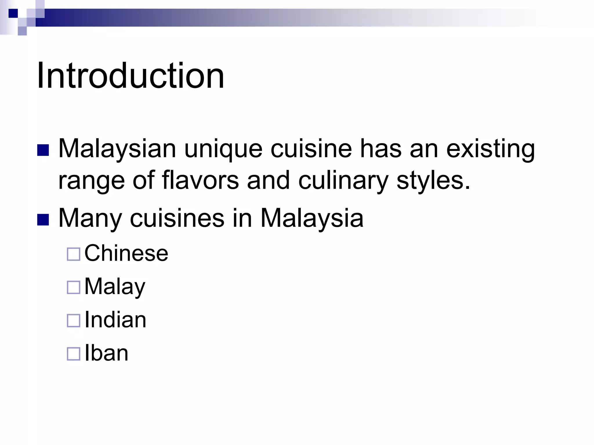 Malaysian cuisine is influenced by Chinese, Malay, Indian, and Iban cuisines. Large numbers of immigrants from China and India introduced their distinct culinary styles. Signature Malaysian dishes include nasi lemak, a coconut rice dish with sambal belacan shrimp paste sauce; char kway teow, stir-fried noodles with shrimp and soy sauce; and roti canai, flatbread served with curry. Nyonya cuisine reflects the blending of Chinese and Malay influences, seen in dishes like fish head curry with tamarind and assam laksa noodles with coconut milk. Sarawak cuisine features kek lapis multilayer cakes and manuk pansuh bamboo-steamed chicken
