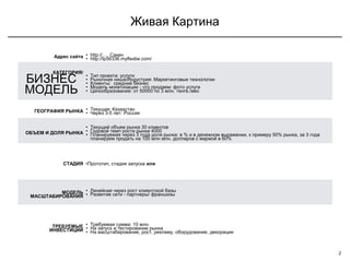 Документ представляет собой бизнес-план для фотостудии 'Живая Картина', нацеленной на предоставление высококачественных фотографических услуг для среднего бизнеса в Казахстане и потенциально в России. Команда, состоящая из студентов, планирует привлечь инвестиции в размере 10 миллионов тенге для старта и масштабирования бизнеса, с целью завоевания 50% рынка в течение трех лет. Основные преимущества проекта — доступные цены, оригинальность и креативный подход к услугам.