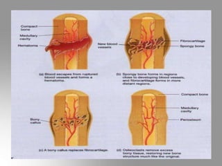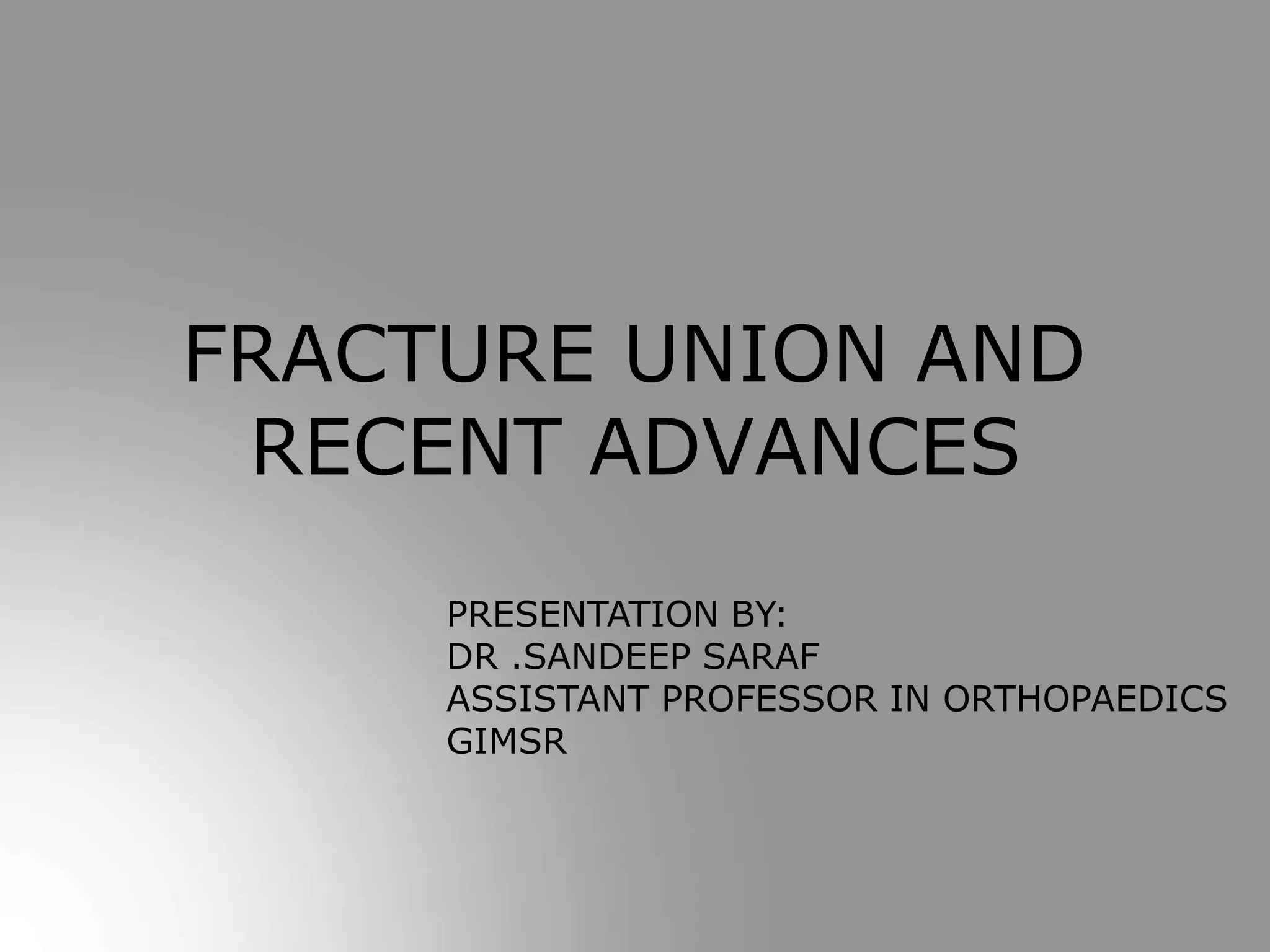 - The document summarizes fracture union and recent advances in fracture treatment. It discusses the typical phases of fracture healing (reactive, reparative, remodeling) and influencing factors like local factors, chemical factors, vascular factors, and more.