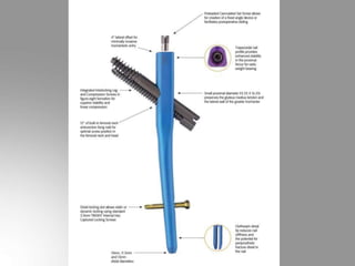 - Recent advances discussed include new intramedullary nail designs like the proximal femoral nail and Expert Tibial Nail to improve fixation of hip and tibial fractures. Other innovations mentioned are elastic nailing for pediatric fractures, the Multiloc nailing system for humerus fractures, and the angular stable locking system to reduce movement at fracture sites.