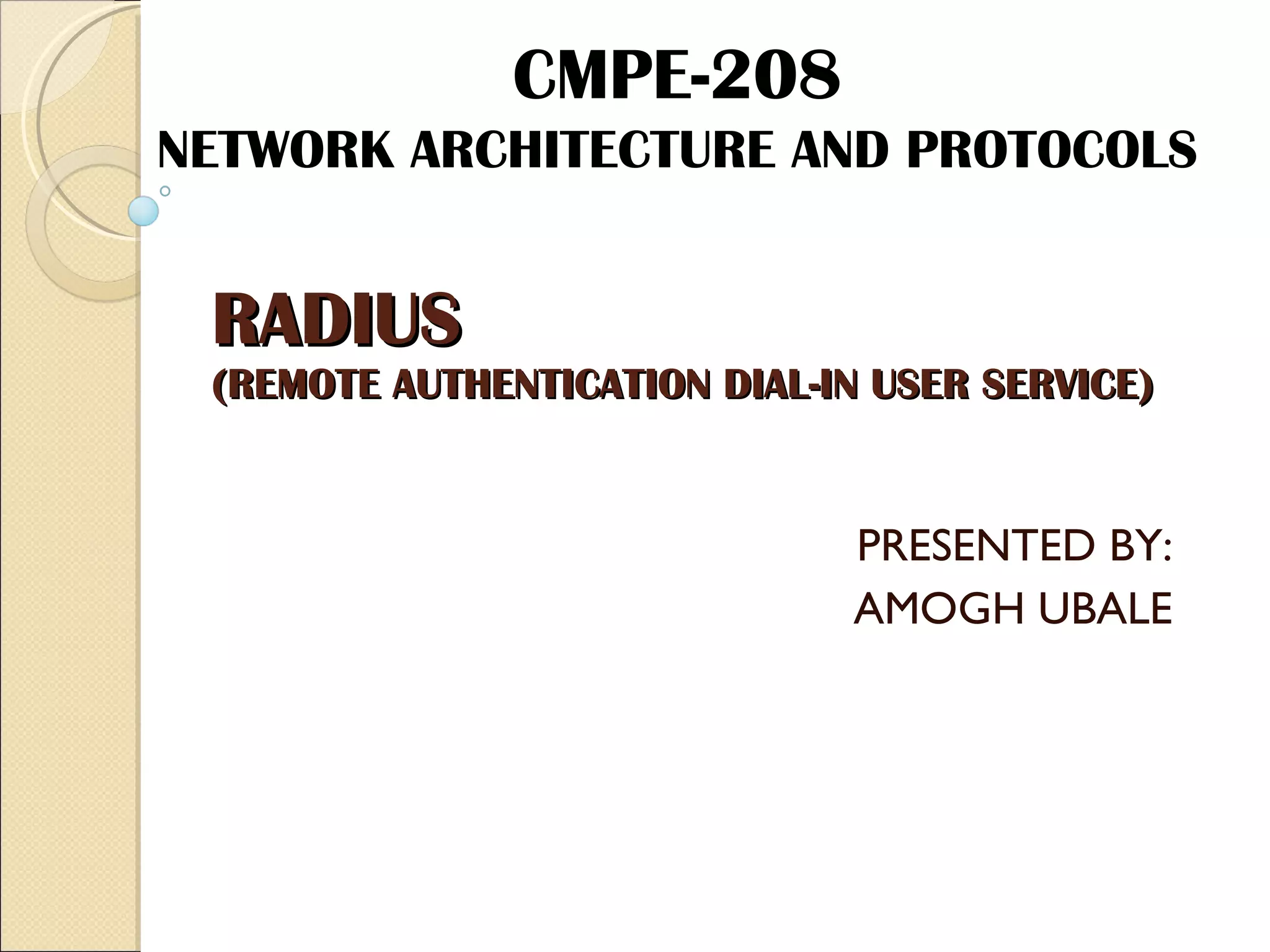 RADIUS (Remote Authentication Dial In User Service) is a protocol that provides authentication, authorization and accounting functionality. It is commonly used for remote access to networks using modems or VPNs. The RADIUS protocol uses UDP and runs on ports 1812 and 1813. It operates on a client-server model where the client is typically a network access server and the server handles authentication requests from clients. RADIUS provides basic security through MD5 hashing of packets and a shared secret between clients and servers. However, it is vulnerable to sniffing and spoofing attacks.