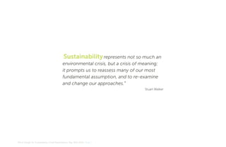 The document discusses the concept of Design for Sustainable Behavior (DfSB), emphasizing the importance of creating meaningful experiences to encourage behavior change towards sustainability. It explores various strategies, frameworks, and models that integrate behavioral psychology with design to foster more responsible consumption and user engagement. The aim is to empower consumers to bridge the gap between environmentally conscious and mainstream behavior, promoting a deeper relationship between users and sustainable products.