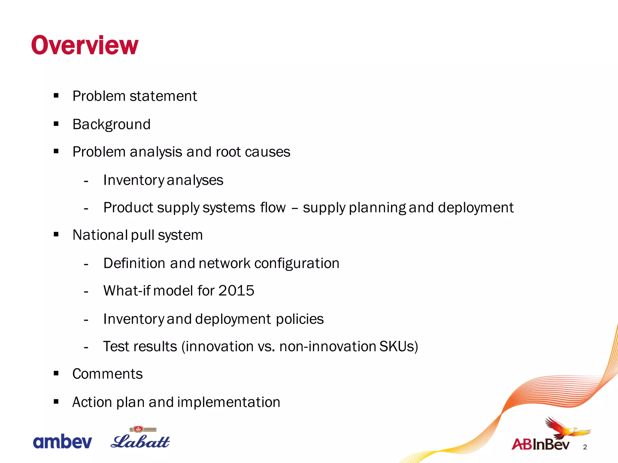 The document proposes a solution to improve service levels for single-source SKUs while maintaining supply chain losses. It involves implementing a national two-bin replenishment pull system with a multi-echelon inventory optimization model. Simulation results show the approach improves customer delivery performance and reduces inventory levels for non-innovation and innovation SKUs. Further refinement and testing of the model is recommended before full implementation.