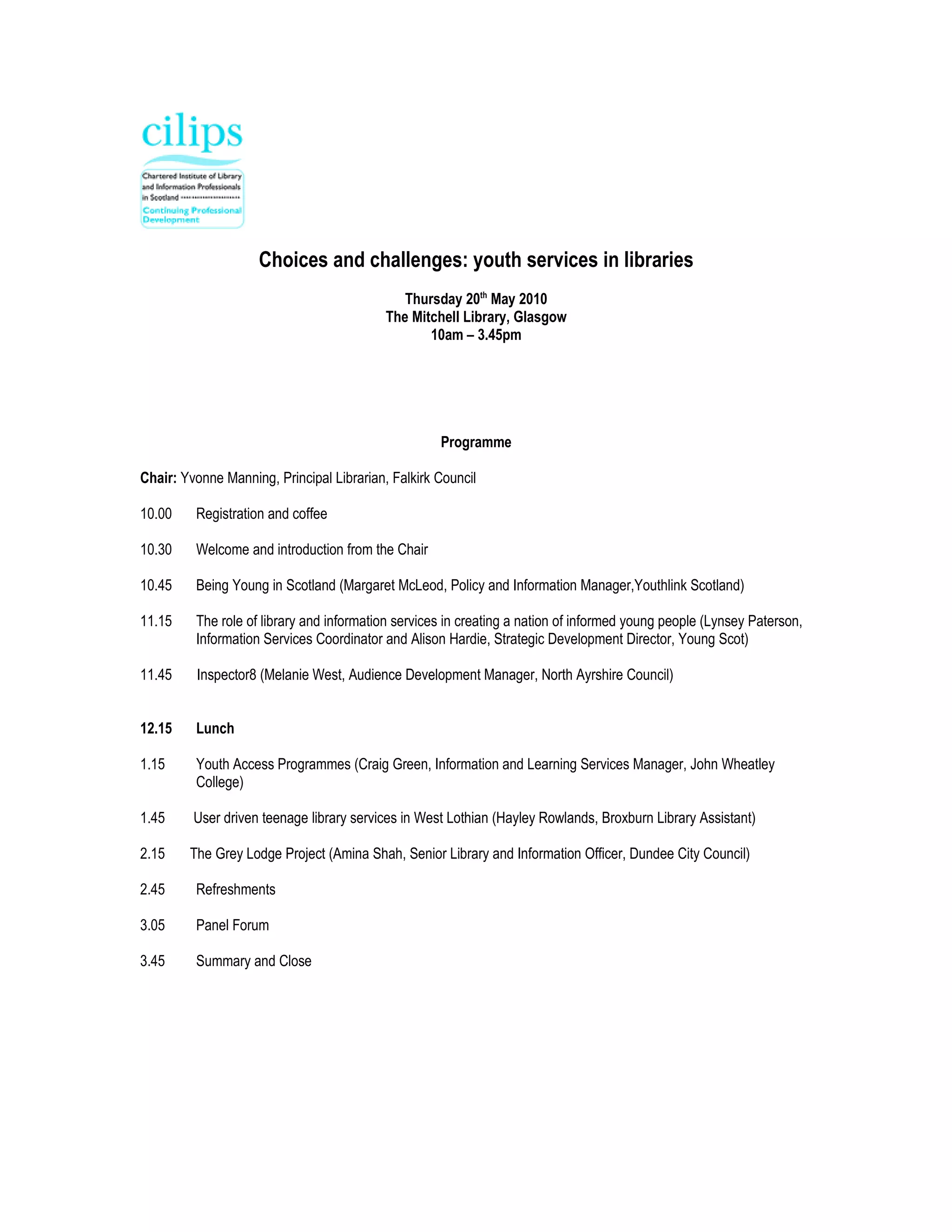 The document outlines the programme for a conference titled "Choices and challenges: youth services in libraries" held at the Mitchell Library in Glasgow. The programme included presentations on topics like the role of libraries in informing young people, youth access programs, and user-driven teenage library services. Speakers represented organizations like Youthlink Scotland, Young Scot, North Ayrshire Council, John Wheatley College, and Dundee City Council. The event included sessions on these topics as well as a panel forum and concluded with a summary and close.