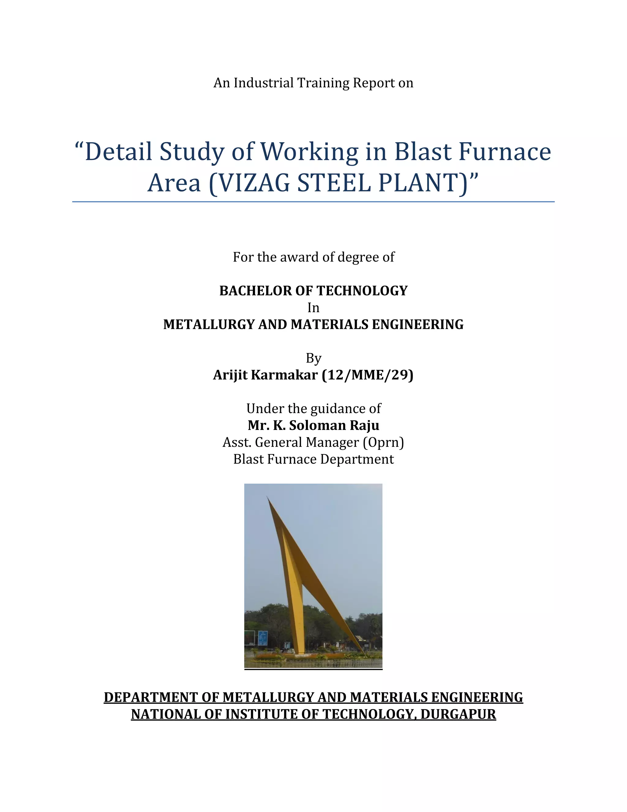 This document provides details from Arijit Karmakar's industrial training report on working in the blast furnace area of Vizag Steel Plant. It describes the various departments in the blast furnace area, including the stock house, cast house, gas cleaning plant, and others. It discusses the stock house in detail, including how raw materials like iron ore, sinter, coke, and additives are received, stored in bunkers, and sent to the blast furnace according to requirements. It also covers dust control measures like electrostatic precipitators used in the stock house.