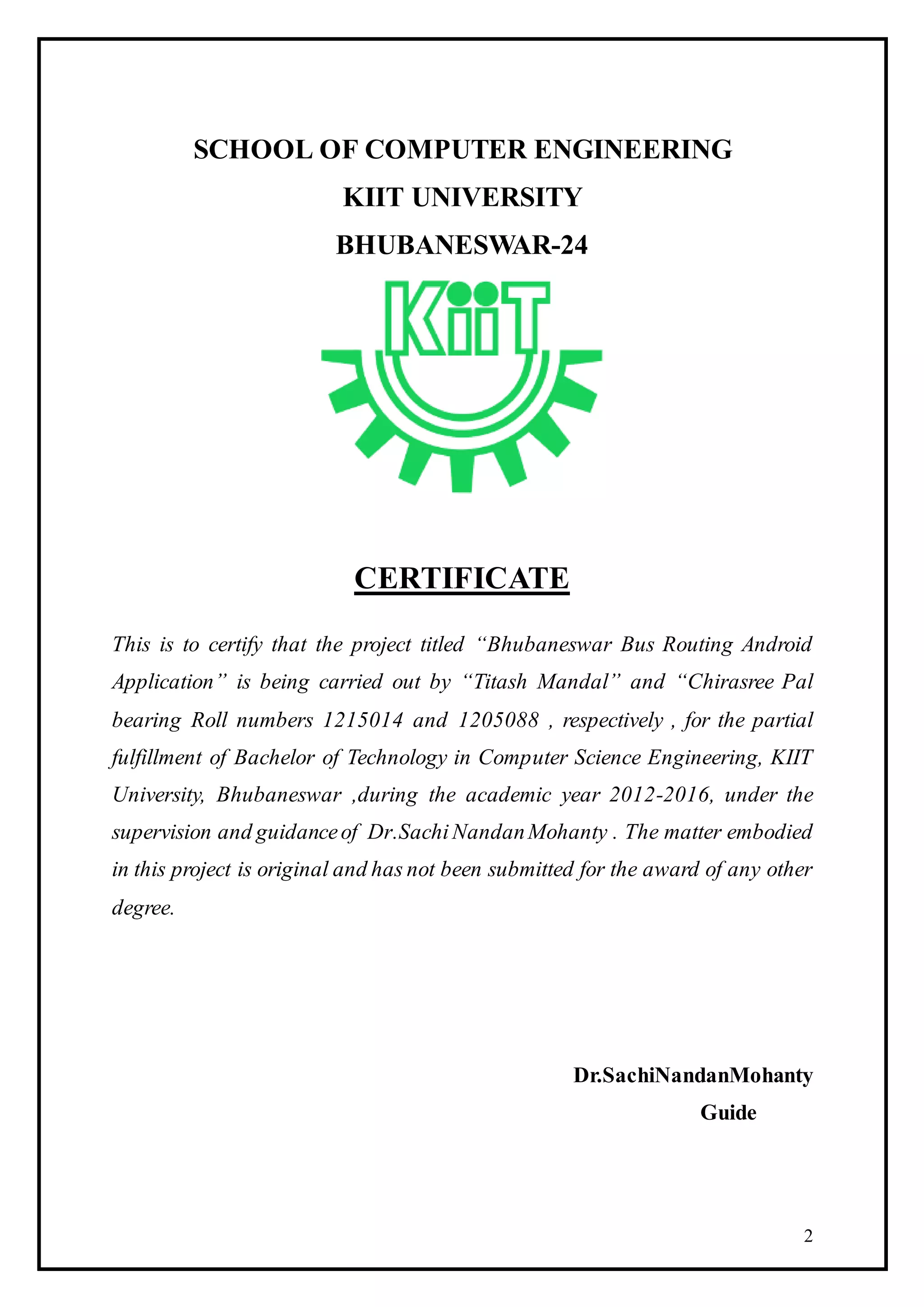 This document provides a project report on the development of a Bhubaneswar Bus Routing Android application. The report includes sections on objectives, software requirements specification, progress achieved through diagrams, screenshots of the application, and hardware and software requirements. The application aims to help users find convenient bus routes and nearby bus stops in Bhubaneswar through features like entering a source and destination, viewing bus routes and fares, and accessing a police station directory. Diagrams show the system architecture, classes, use cases, and activities involved. Screenshots demonstrate initial screens for user input and GPS navigation. Requirements specify the needed deployment environment, devices, and development tools.