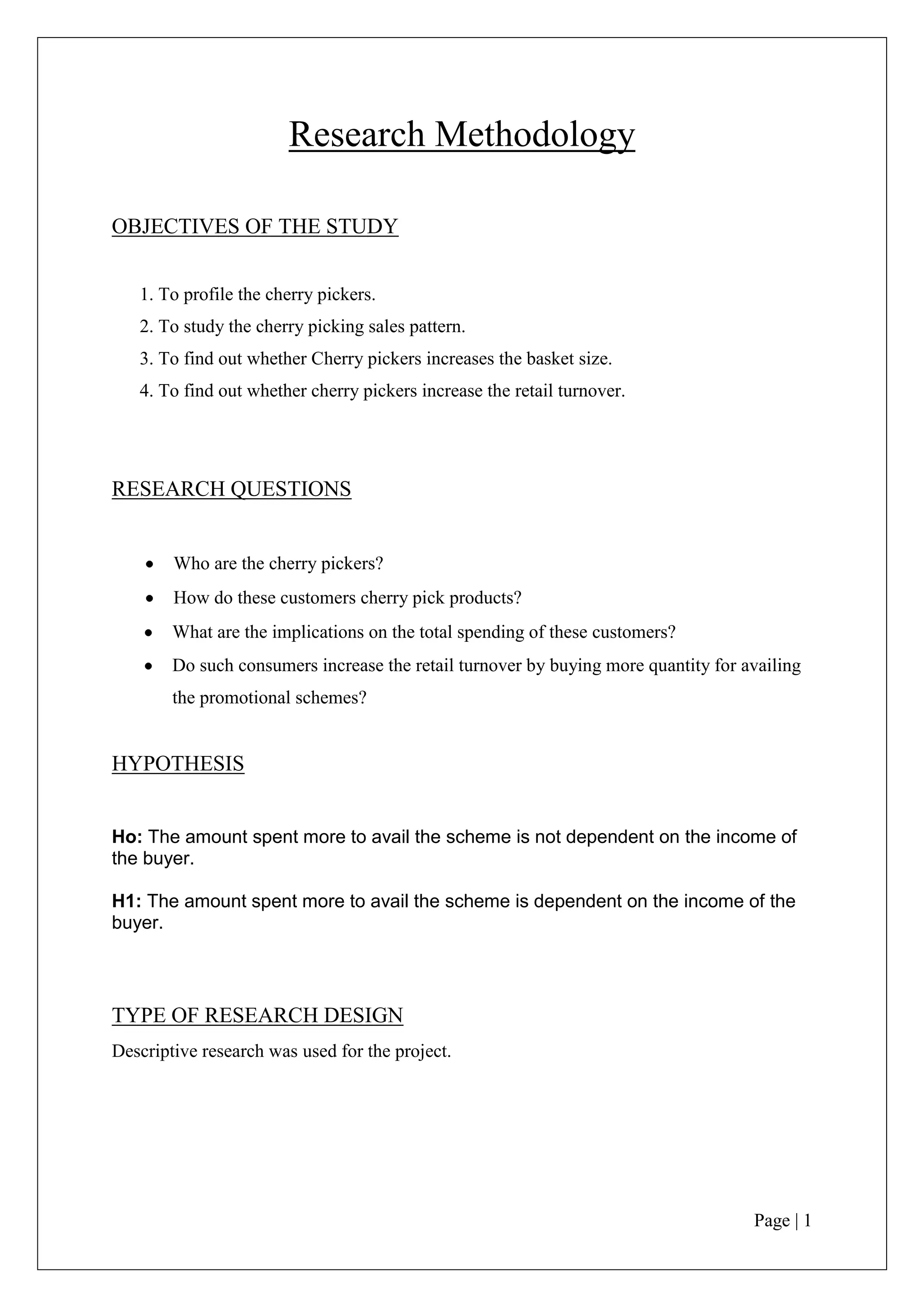The document outlines a research study on "cherry pickers" or customers who strategically purchase select products to take advantage of promotional schemes. The objectives are to profile these customers and understand their shopping patterns and the impact on retailers. A hypothesis is proposed that the amount spent to avail schemes is dependent on income. A quantitative survey of 100 customers leaving a Big Bazaar store will be conducted using a questionnaire to collect primary data and analyze spending patterns based on income. The expected contribution is a fresh understanding of this behavior and its impact on marketing strategies.