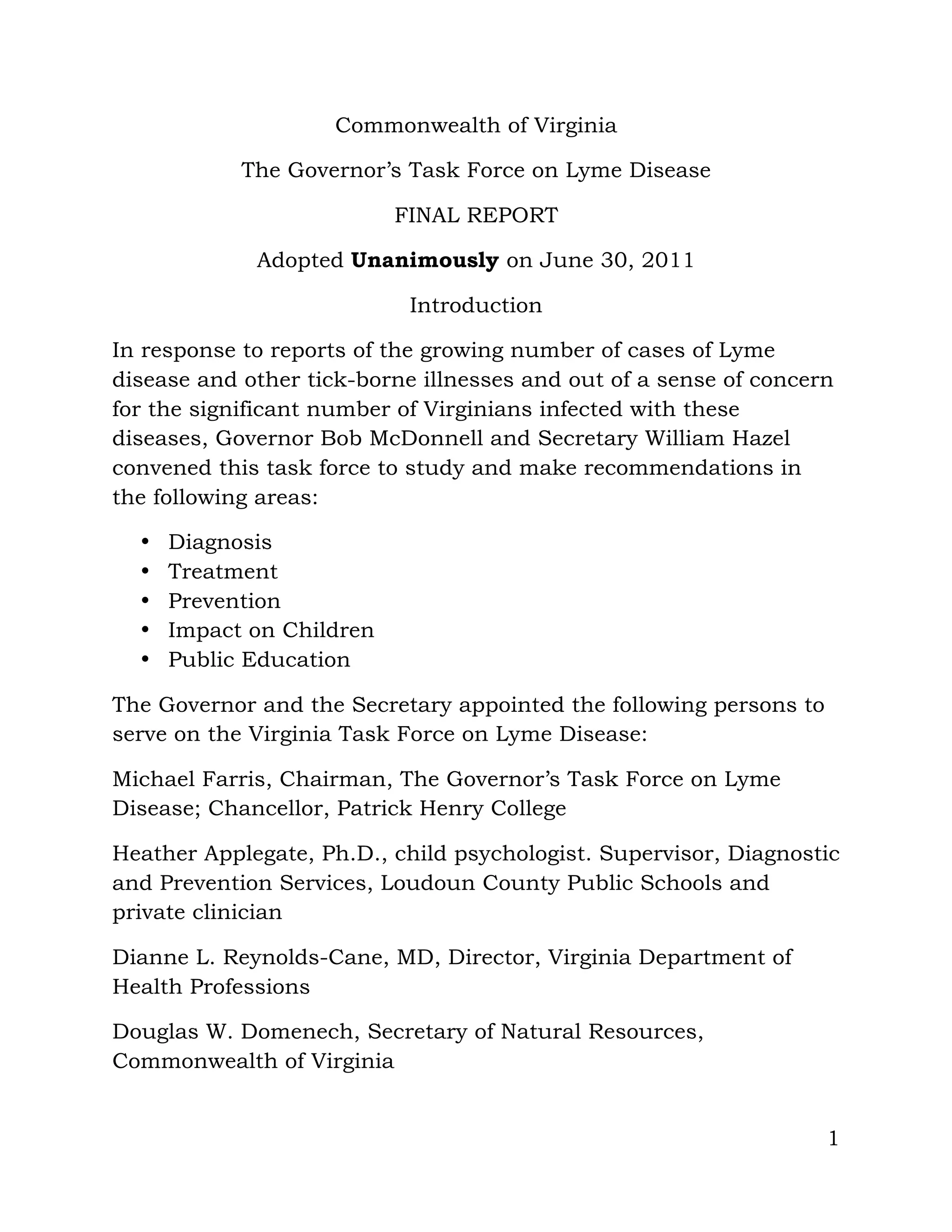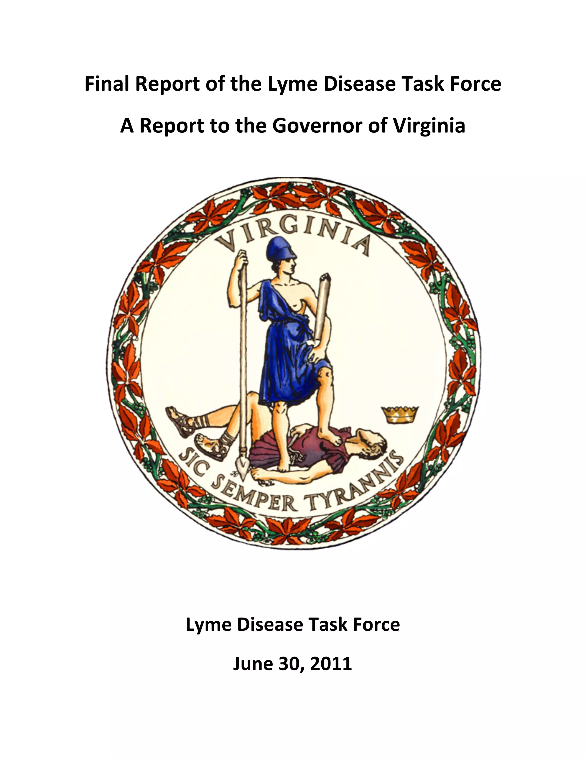 The document is the final report of the Governor's Task Force on Lyme Disease in Virginia. It summarizes the task force's process, including holding hearings around the state to hear from citizens affected by Lyme disease and experts. It makes several general observations about the growing problem of Lyme disease in Virginia and the need for greater awareness, prevention efforts, and research. The task force's main recommendation is that the Virginia Department of Health receive increased funding to expand surveillance of tick-borne illnesses and education for the public and healthcare providers.