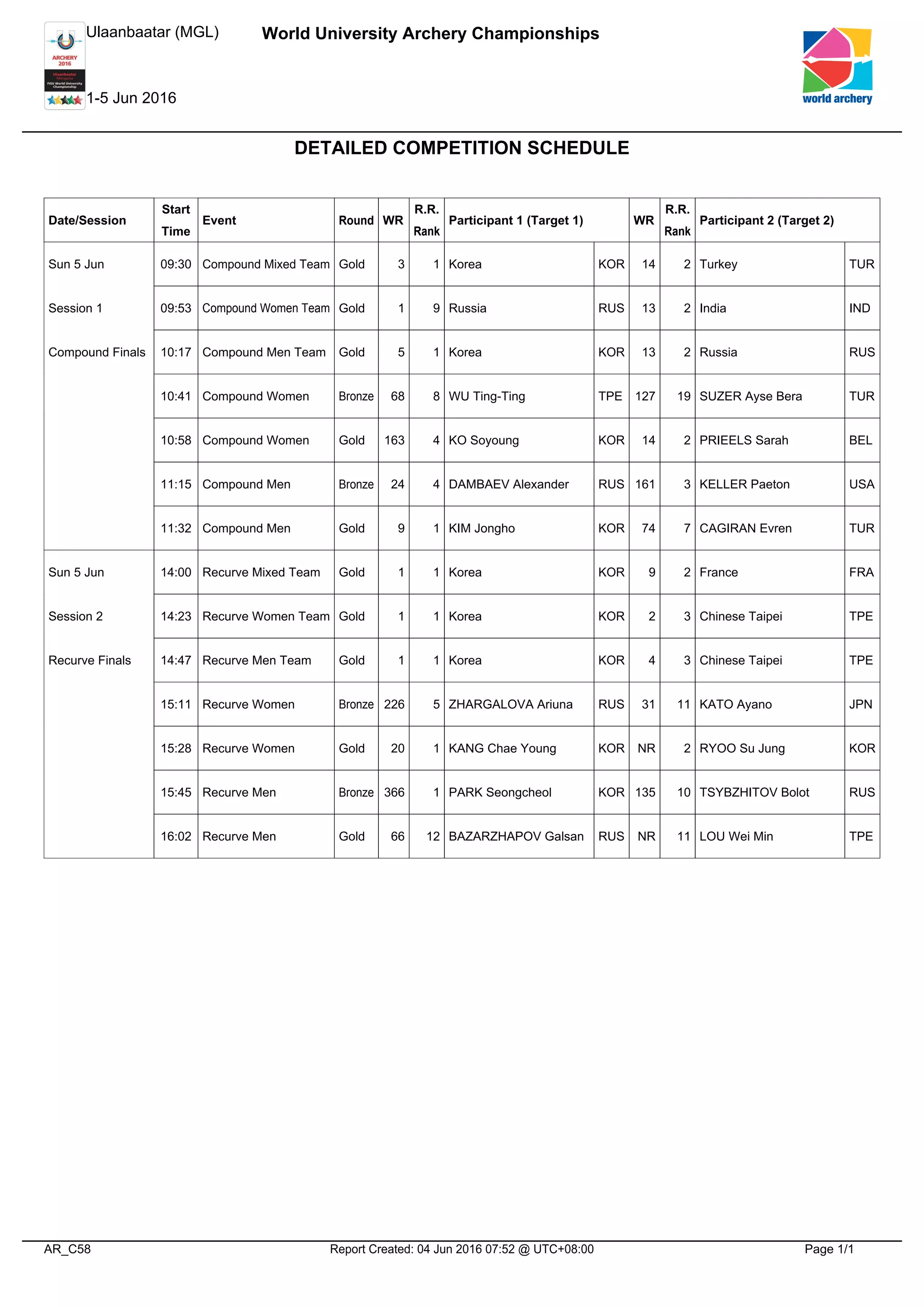 The document provides the detailed competition schedule for the World University Archery Championships taking place from June 1-5, 2016 in Ulaanbaatar, Mongolia. On the first day of competition, June 5, the schedule includes the compound mixed team, women's team, and men's team gold medal matches in the morning session and the recurve mixed team, women's team, and men's team gold medal matches in the afternoon session. It also lists the individual bronze and gold medal matches for each category to take place between the team events.