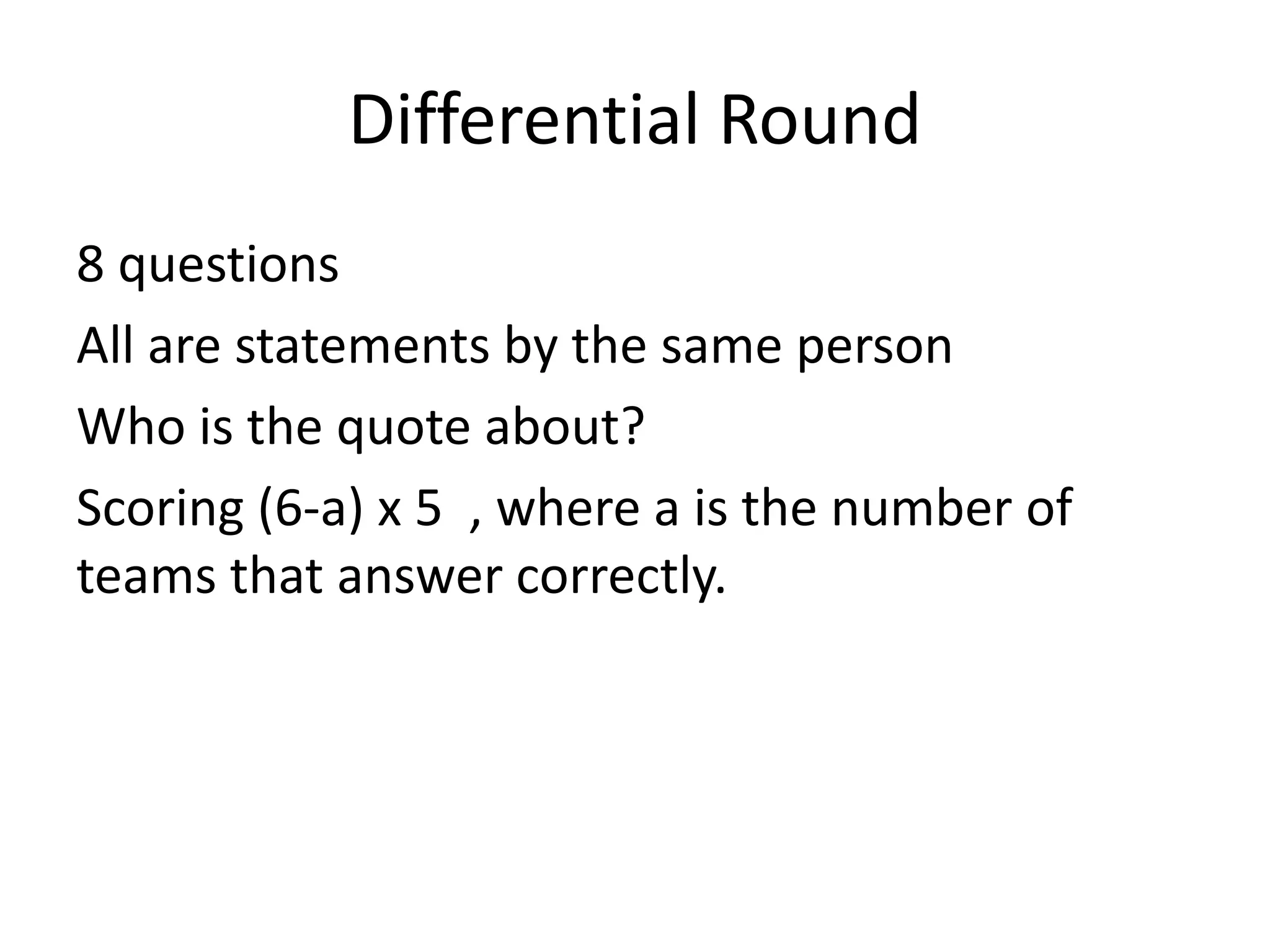 This document contains a quiz with 8 multiple choice questions about quotes said by Sandor "The Hound" Clegane from Game of Thrones. Each question is followed by 4 answer choices to identify who or what the quote is about. The scoring system awards points based on the number of teams that answer correctly.