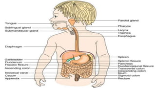 The document is a module on gastrointestinal system disorders for children. It outlines objectives to discuss GI anatomy and physiology, selected diseases including diagnosis, management, and nursing care. The content will review GI anatomy, diagnostic techniques, and specific diseases. It will then discuss the anatomy and physiology of the GI system, describing it as the alimentary canal starting at the mouth and ending at the anus, which breaks down food through digestive processes and enzymes into constituents that can be absorbed.