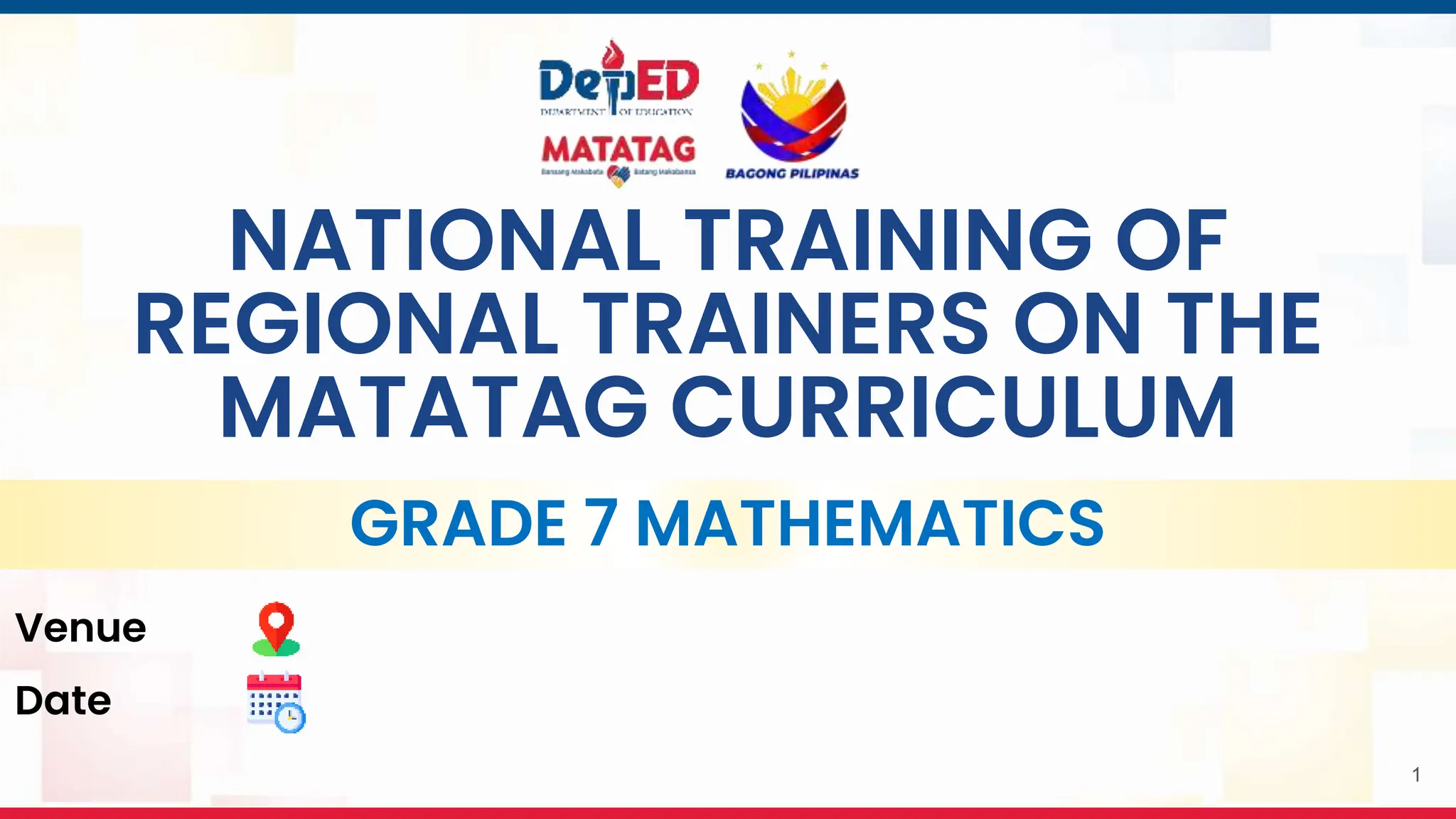 The document outlines a national training program for regional trainers on the Matatag curriculum, specifically for Grade 7 mathematics, detailing a structured five-day training matrix that includes pre-assessments, instructional designs, curriculum standards, and collaborative learning sessions. It emphasizes the curriculum's objective of developing students' mathematical proficiency and problem-solving skills through enhanced pedagogical approaches and revised content standards. Additionally, it highlights various issues within the current mathematics curriculum and offers solutions for effective teaching practices and professional standards for educators.