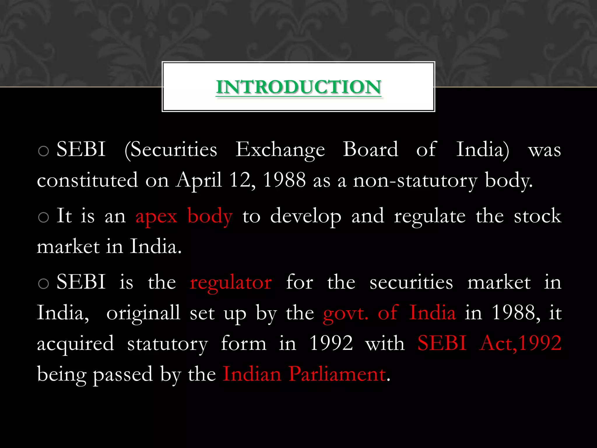 SEBI was established in 1988 as a non-statutory body and was given statutory powers in 1992 with the passing of the SEBI Act. The SEBI Act established SEBI as the regulator for the securities market in India and granted it powers to protect investors, regulate stock exchanges and intermediaries, and promote orderly growth of the securities market.