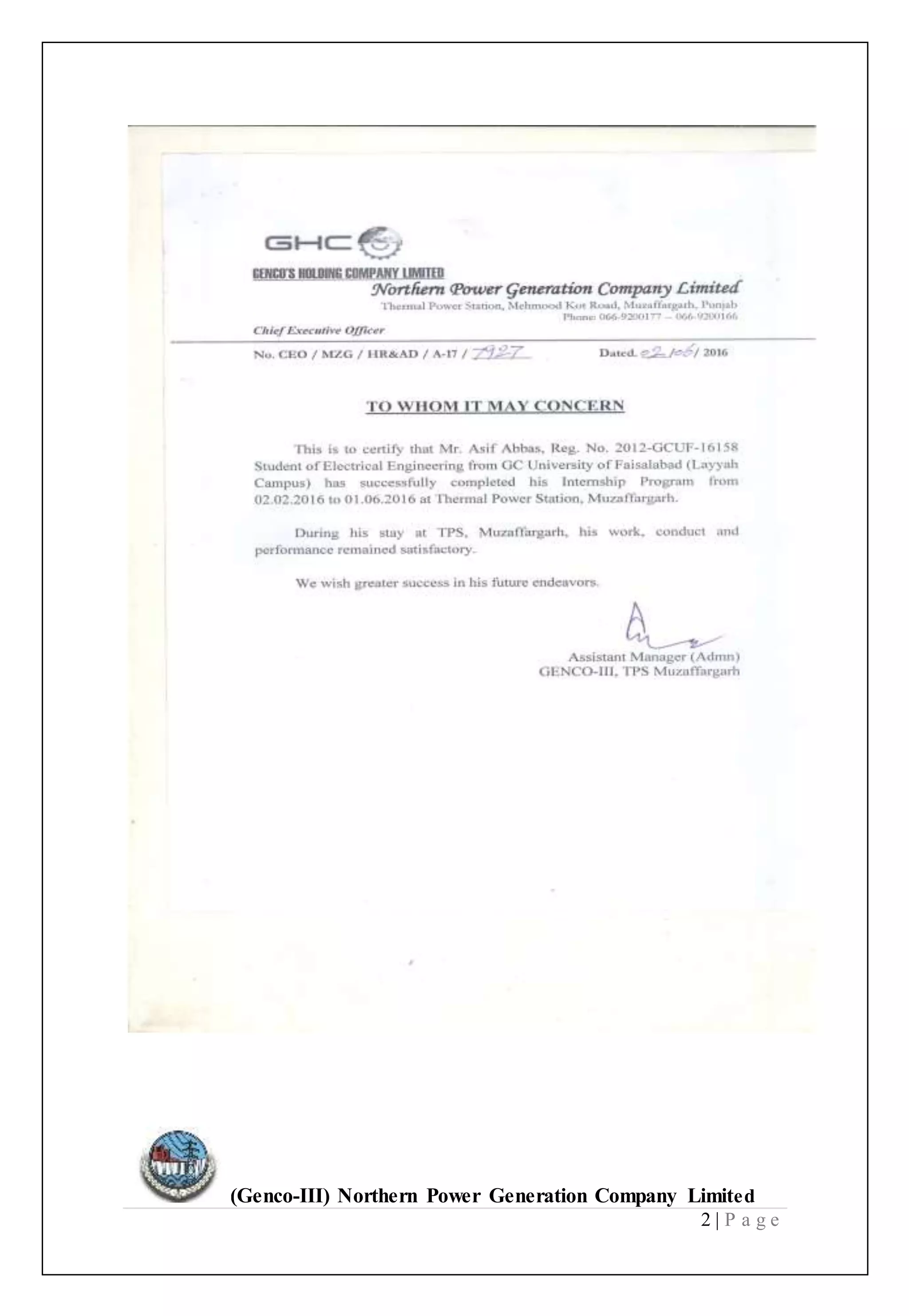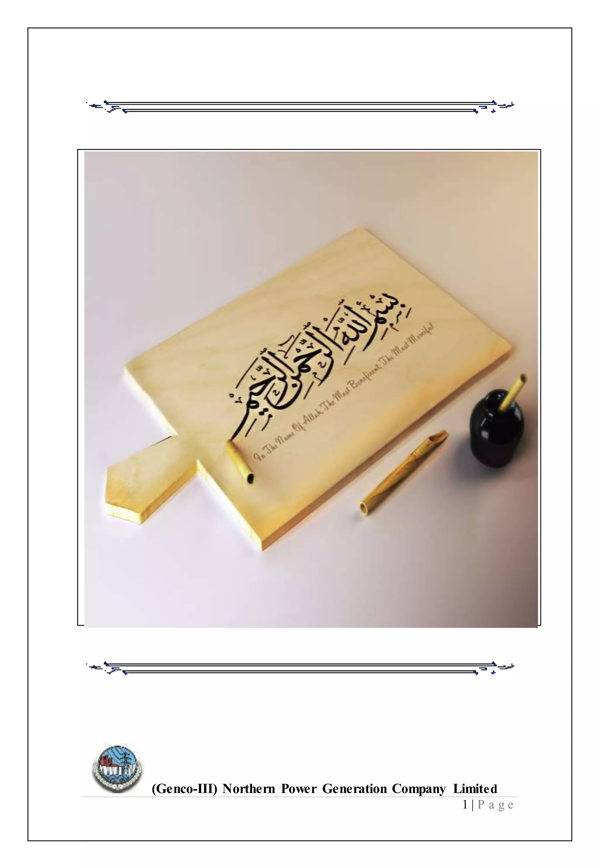 This document provides an overview of the (Genco-III) Northern Power Generation Company Limited in Pakistan. It discusses the company's 6 power generation units with a total capacity of 1,370MW, fueled by furnace oil. The report outlines the key components of the thermal power plant, including the boiler, steam turbine, condenser, water feeding system, fuel facilities, electricity generation equipment, and 220kV switchyard. It also includes sections on the objectives, goals and operations of the power plant.