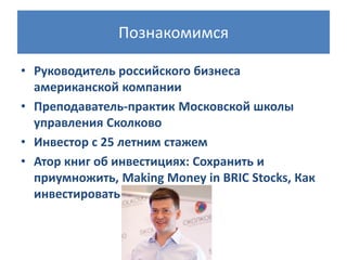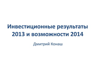 Документ обсуждает инвестиционные результаты 2013 года и перспективы 2014 года, фокусируясь на рынке акций и облигаций в России и США. Автор, Дмитрий Конаш, анализирует тенденции на глобальных рынках, отмечая высокую волатильность и доходность российской экономики, а также вопросы о способности инвесторов обогнать рынок. Кроме того, он предлагает практические рекомендации по созданию сбалансированного инвестиционного портфеля.