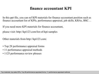 This document discusses key performance indicators (KPIs) for finance accountants. It provides examples of KPIs, steps for creating KPIs, common mistakes to avoid, and how to design effective KPIs linked to strategy and goals. The document recommends visiting an online site for additional KPI samples, performance appraisal forms, review methods and phrases to use when evaluating finance accountant performance.