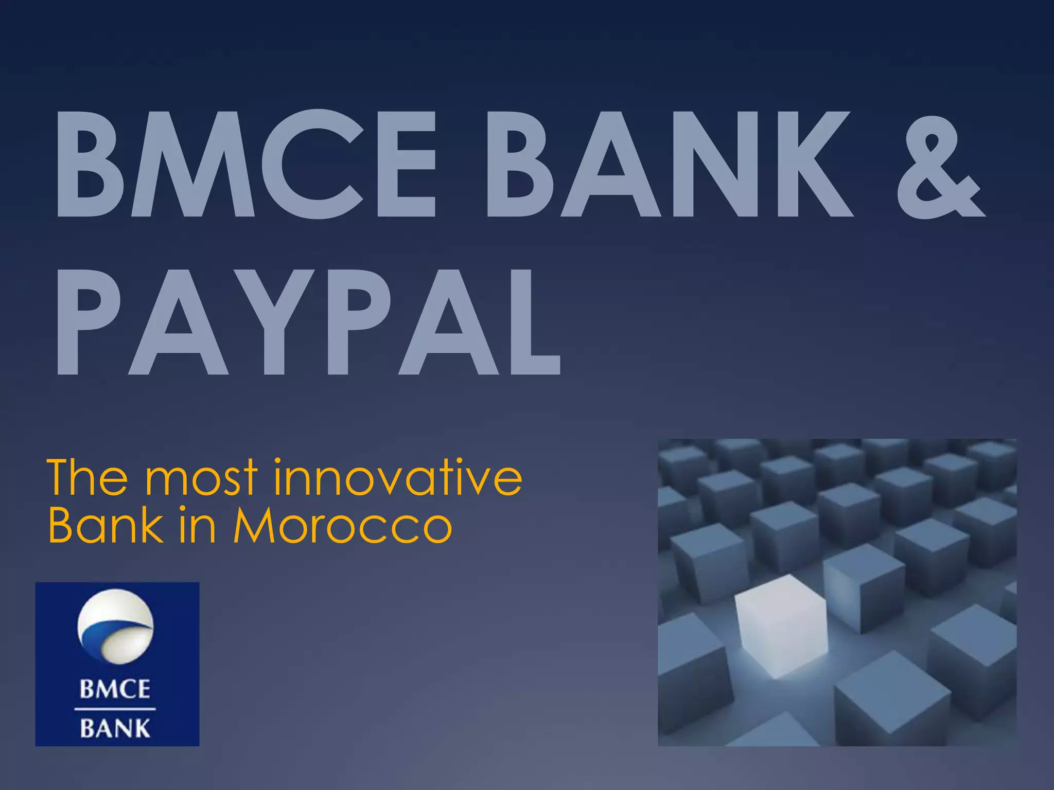This document discusses BMCE Bank's partnership with PayPal to expand e-commerce and money transfer services in Morocco. It provides details on BMCE Bank's current mobile banking, e-banking, and remittance transfer projects. For remittances, it estimates the potential market size at $320 million given over $6.4 billion is transferred annually by the over 5 million Moroccans living abroad. The partnership with PayPal could help lower fees for money transfers and capture a share of the market from companies like Western Union. It also presents market size projections for key sectors in 2010 and 2016 that could be served through PayPal, such as telecom, airlines, utilities, travel, and hotels, with