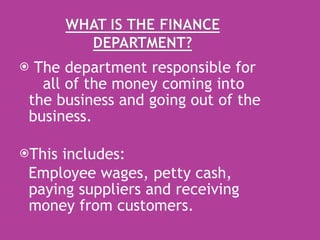 The document provides information about the finance department and their responsibilities which include handling employee wages, petty cash, paying suppliers, and receiving money from customers. It also discusses tasks related to invoicing customers, issuing credit notes for returned goods, and sending statements with payment information. The document contains examples of an invoice and credit note forms and instructs the reader to complete tasks related to entering information into spreadsheets.