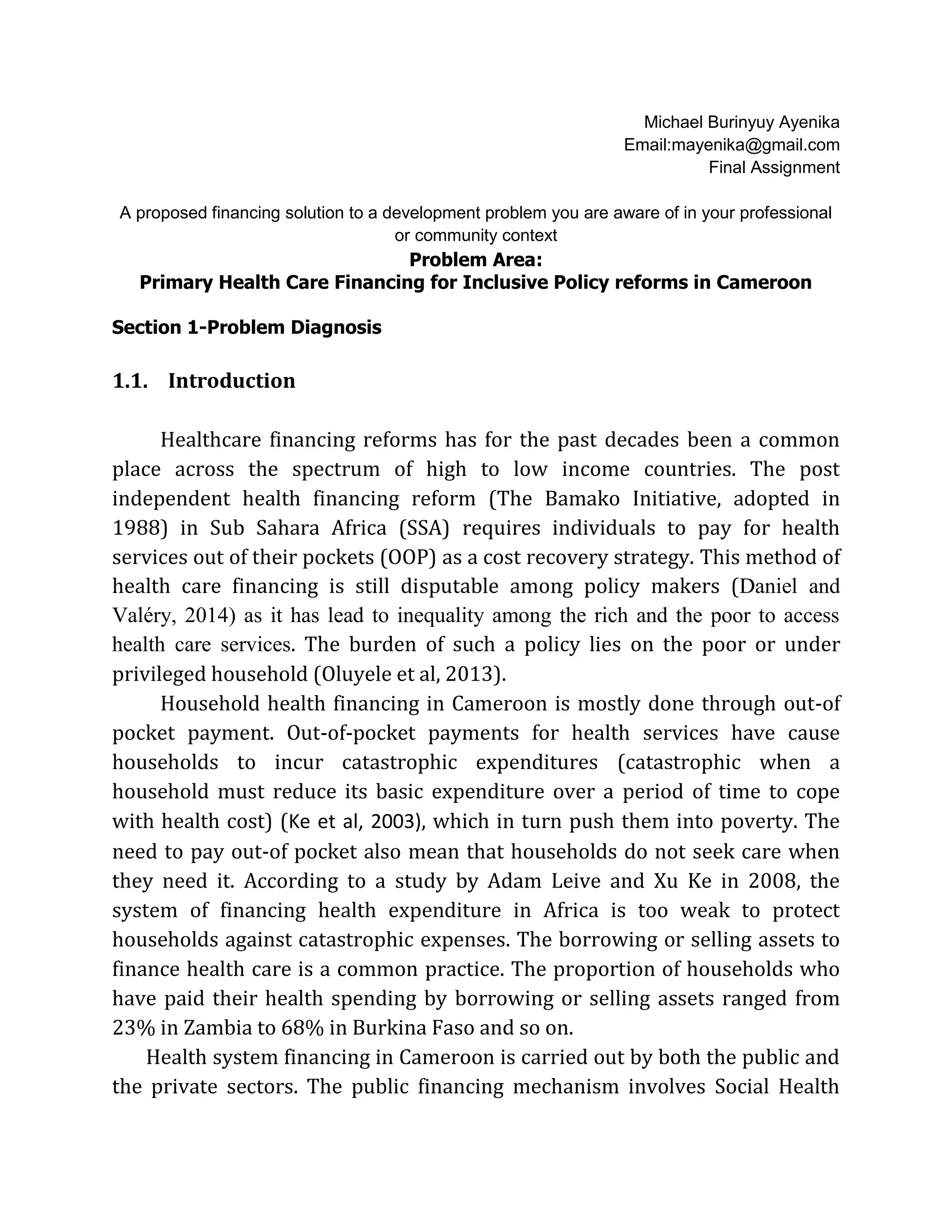 This document discusses financing primary health care in Cameroon. It notes that currently, household health financing is mostly done through out-of-pocket payments, which can lead to catastrophic health expenditures and push households into poverty. While Cameroon has social health insurance and community-based insurance programs, coverage remains low, with 62% of Cameroonians lacking access to quality healthcare. The document proposes studying alternative sustainable financing methods to improve access and reduce financial barriers to healthcare.