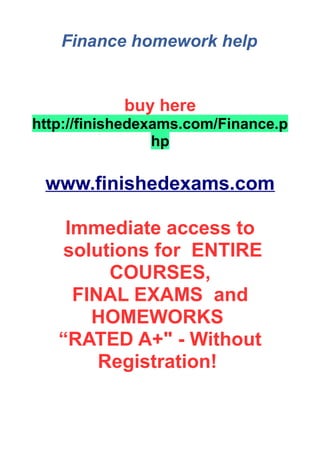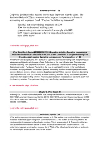 This document provides information about online finance homework help and solutions to finance questions and exams. It includes links to purchase solutions to entire courses, exams, and homework assignments for prices ranging from $3-$11 per question. The questions cover topics like corporate bond analysis, cash budgets, inventory lists, accounting audits, and capital budgeting. Clicking the links provided would allow users to access the full solutions to finance problems and exams.