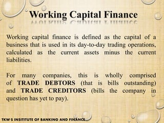 Working capital finance (WCF) refers to a business's capital used in day-to-day operations, calculated as current assets minus current liabilities. It includes various funding types such as cash credit and bill discounting, each having advantages and disadvantages that impact liquidity and credit ratings. Additionally, financial instruments like bank guarantees and letters of credit are essential for managing risks and facilitating international trade.
