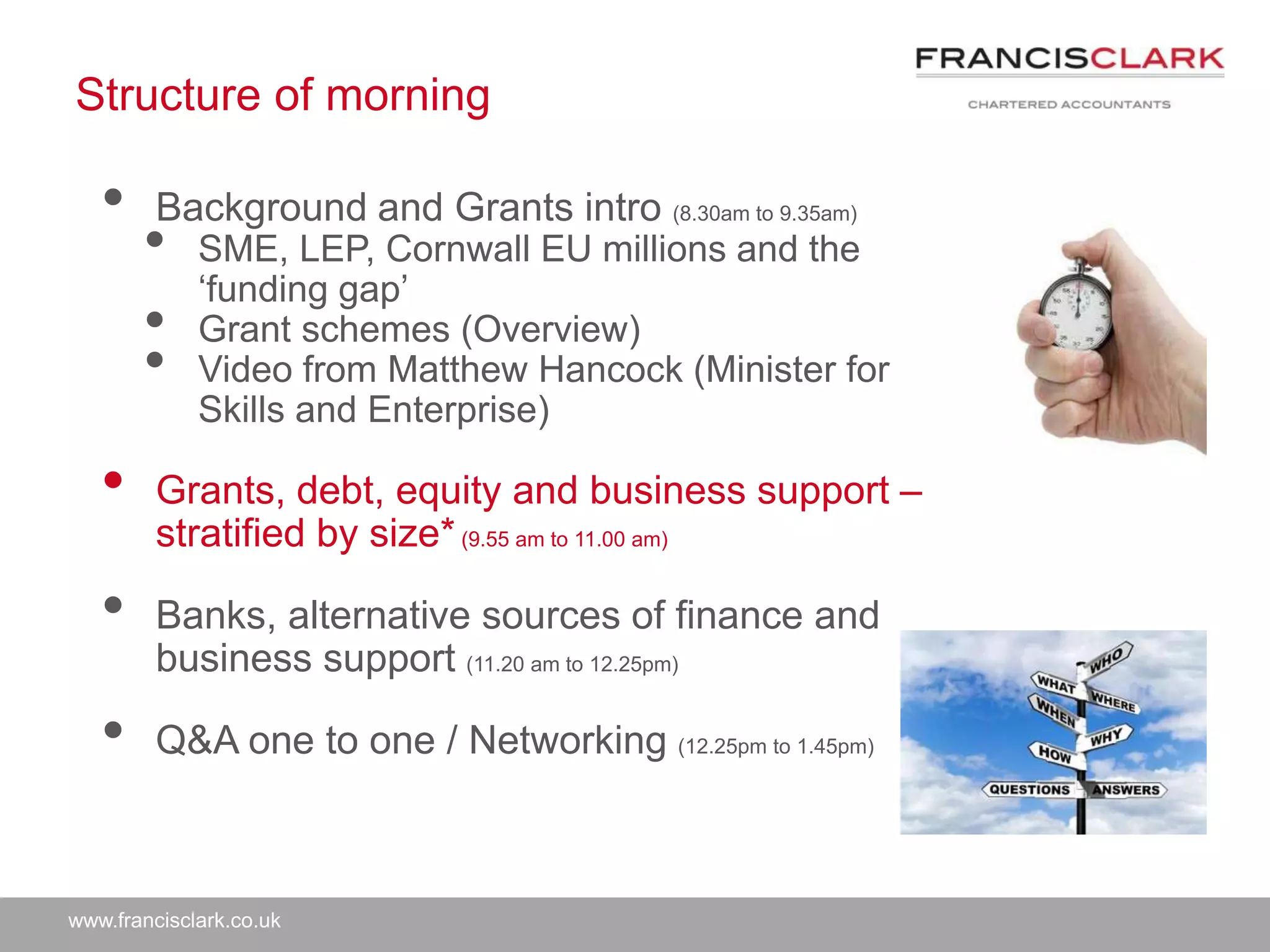 This document provides an agenda and overview for a funding and support event for SMEs. The morning session includes introductions to grants and an overview of funding schemes. Breakout sessions in the afternoon focus on specific funding options for SMEs, including assisted asset purchase grants, loans from the South West Loans Fund, mezzanine funding from Santander, equity funding from the Business Growth Fund and WestBridge Capital, and peer-to-peer lending through Folk 2 Folk. Presenters provide details on eligibility and examples of previous funding. The event aims to help SMEs access various sources of financing to support growth.