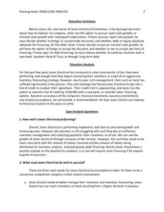 Nelson Jones, owner of Jones Electrical Distribution, must decide how to improve his company's financial situation. He can pursue rapid or minimal sales growth. If pursuing rapid growth, he must decide whether to accept trade discounts and what type of financing to use. Alternatively, he can pursue minimal growth while also deciding on discounts and financing. Jones is struggling with cash flow due to ineffective inventory management and slow customer payments. A new bank has offered to extend Jones' line of credit by $100,000. An analysis of Jones' financials and business environment is needed to make recommendations.