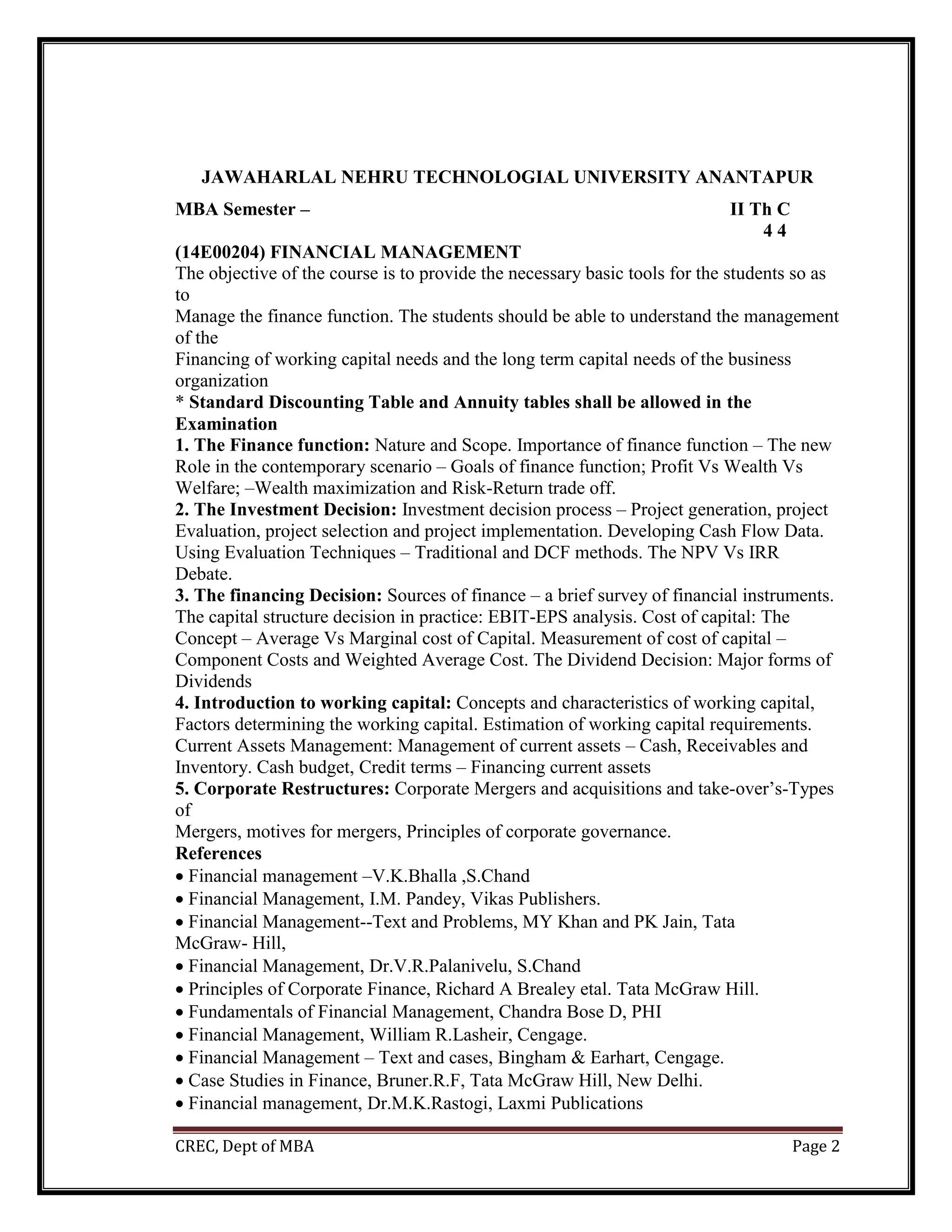 This document contains lecture notes on financial management for an MBA program. It discusses the objectives of the course as providing tools to manage the finance function. It outlines several topics that will be covered, including the finance function, the investment decision process, sources of finance, working capital management, and corporate restructuring. It also lists several references for further reading.