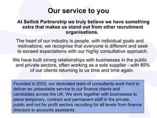 Sellick Partnership is a recruitment agency that focuses on placing finance professionals in temporary, contract, and permanent roles. They take a consultative approach to understand individual candidates and client needs. They have built strong, long-term relationships with over 85% of clients returning repeatedly. Sellick Partnership recruits candidates for a wide range of finance roles across both public and private sectors.