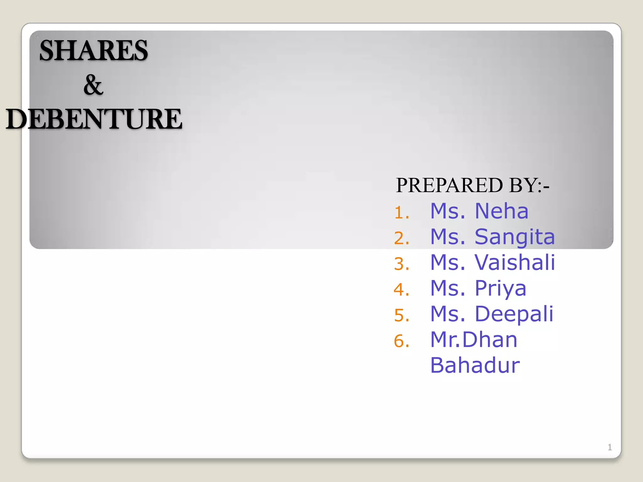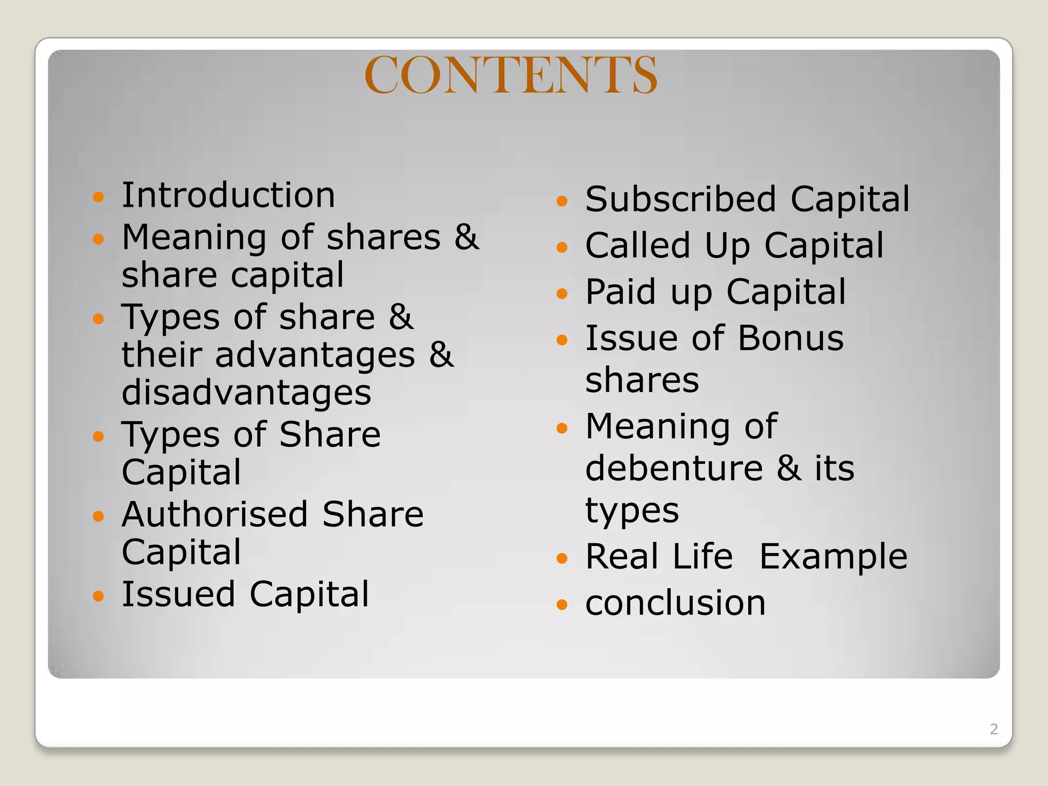 This document provides an overview of shares and debentures. It defines shares and share capital, and describes the different types of shares including equity shares, preference shares, and bonus shares. It also defines debentures and describes different types of debentures. Additionally, it explains various share capital terms like authorized share capital, issued capital, subscribed capital, called up capital, and paid up capital. Real life examples are provided to illustrate the concepts discussed.